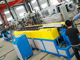 The positive pressure air outlet forming machine consists of a material rack, leveling, hydraulic shearing, square punching, angle punching, round hole punching, valve body forming machine, and bending machine. It adopts full computer PLC control and touch screen operation. It can set any size for cutting according to the operation requirements. The positive pressure air outlet frame is fully automatically cut and produced, which greatly improves the production efficiency and is suitable for fire damper production factories.